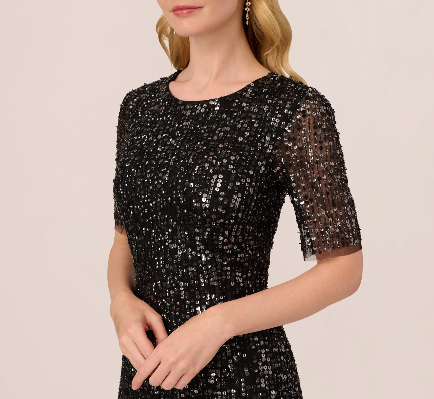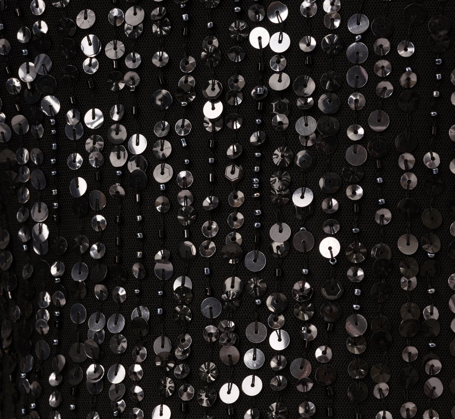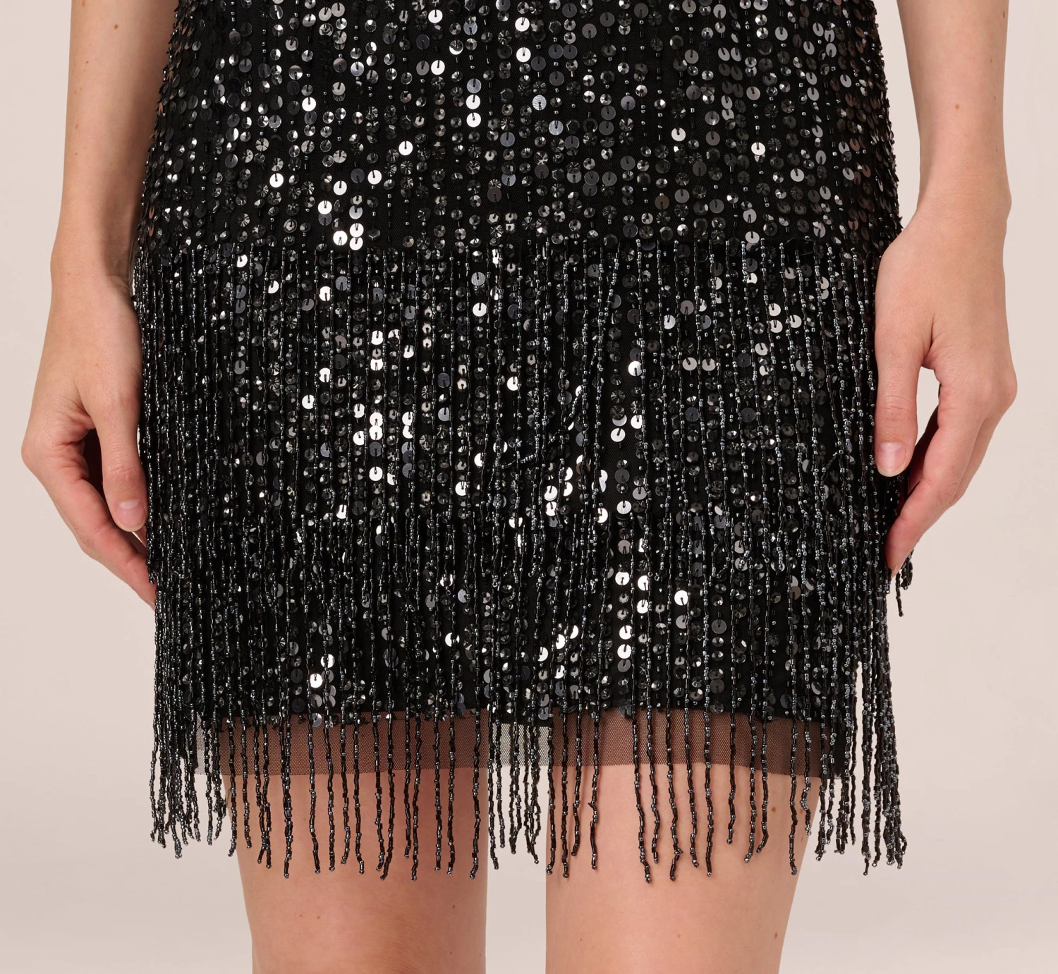 Who doesn’t love dancing the night away in a fringe dress? This cocktail dress features a fitted bodice with a crew neckline, sheer elbow-length short sleeves, and fringe at the skirt hem. Lined through the body, this party dress has a mesh overlay that is covered in rows of allover sequin beading. A zipper closure at the back of this short sleeve dress completes the look. Styled with high heels and statement earrings, this flirty beaded dress is perfect for a cocktail party or wedding.