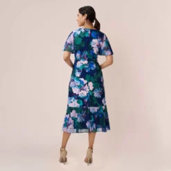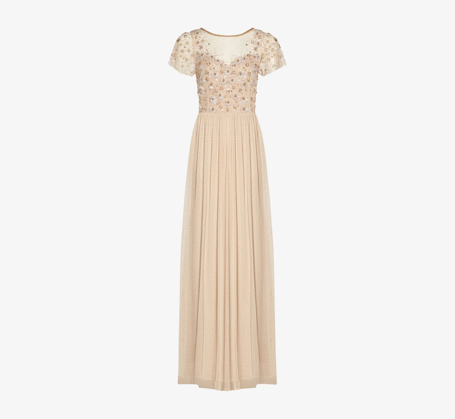 Up your glamour game in our stunning gown crafted of a delicate point d’esprit lace and embellished with stunning handsewn 3D beadwork in a floral pattern. Details with love: the sheer illusion yoke and flutter sleeves, sweetheart neckline and soft pleating at the waist for added movement and sway. Back zip closure. A romantic choice for mothers-of-the-bride/groom, bridal parties, wedding guests and black-tie gala attendees.