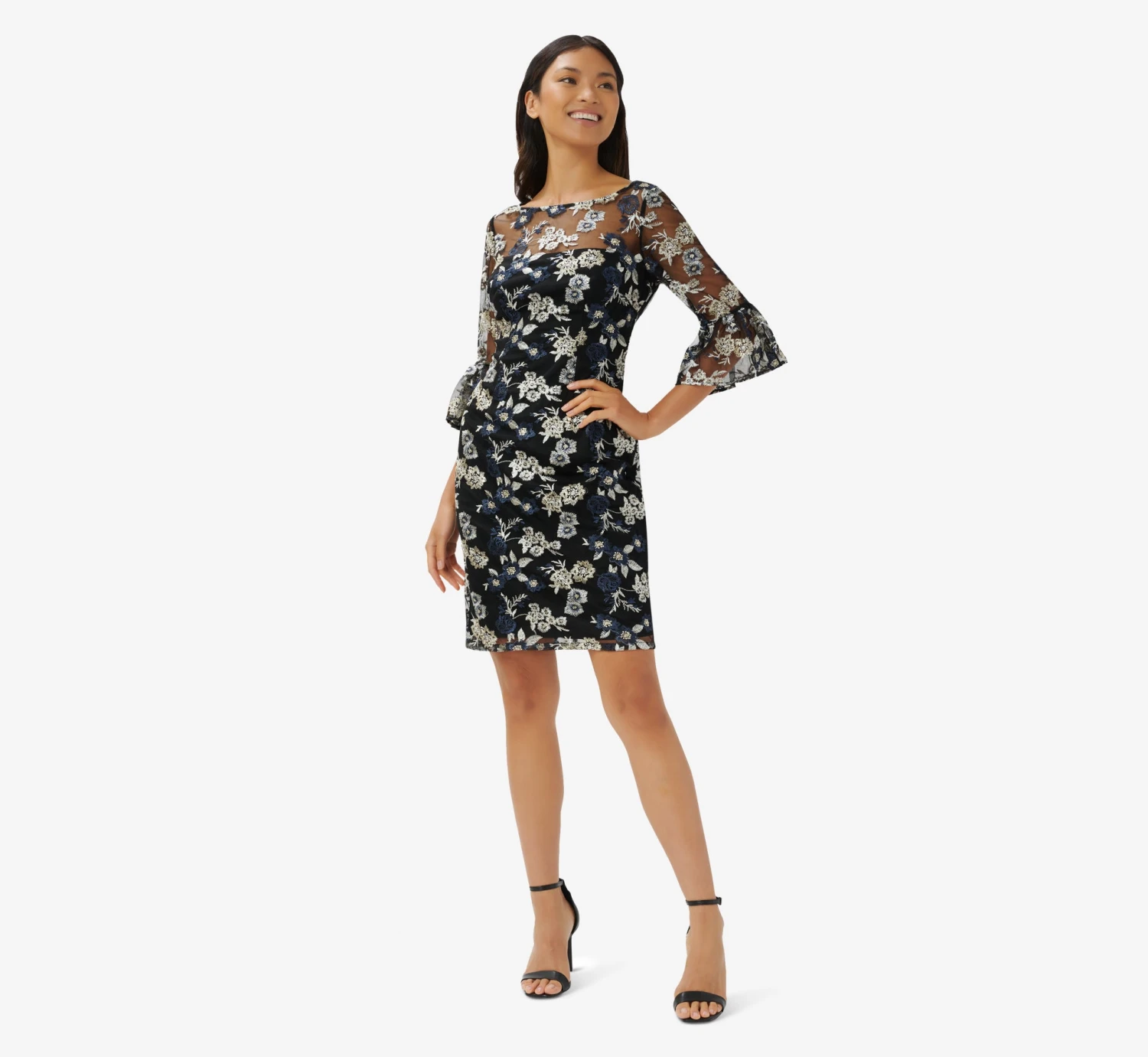 Our distinctly feminine sheath dress is blooming with a pretty mix of florals on a knit mesh overlay and is a perfect choice for a night out. We’re loving the sheer illusion yoke, modern bateau neckline and elbow sleeves with bell cuffs. Flirty v-back. Finished with a back hook-and-eye/zip closure. A definite best dressed guest option at wedding receptions and black-tie galas.