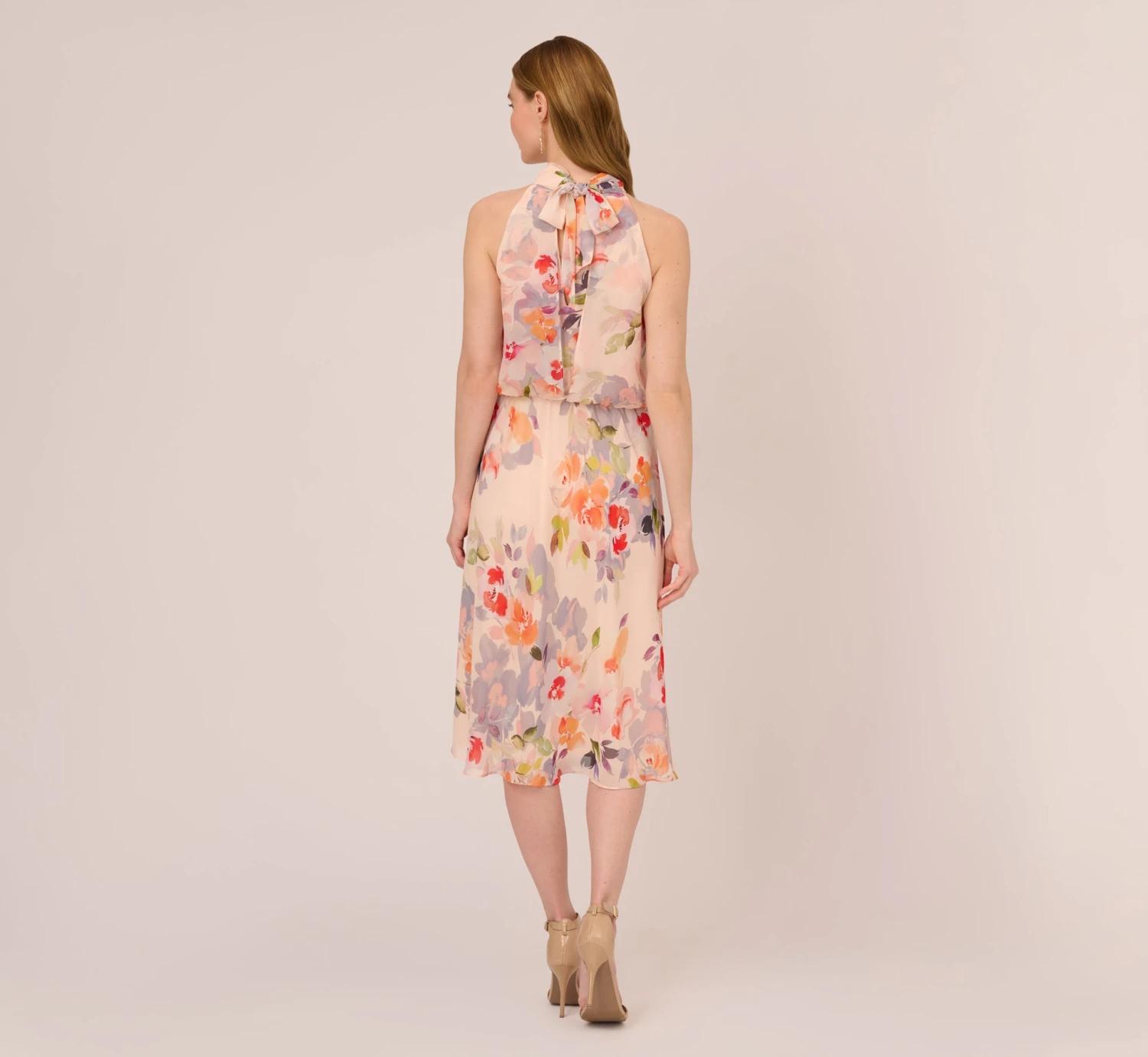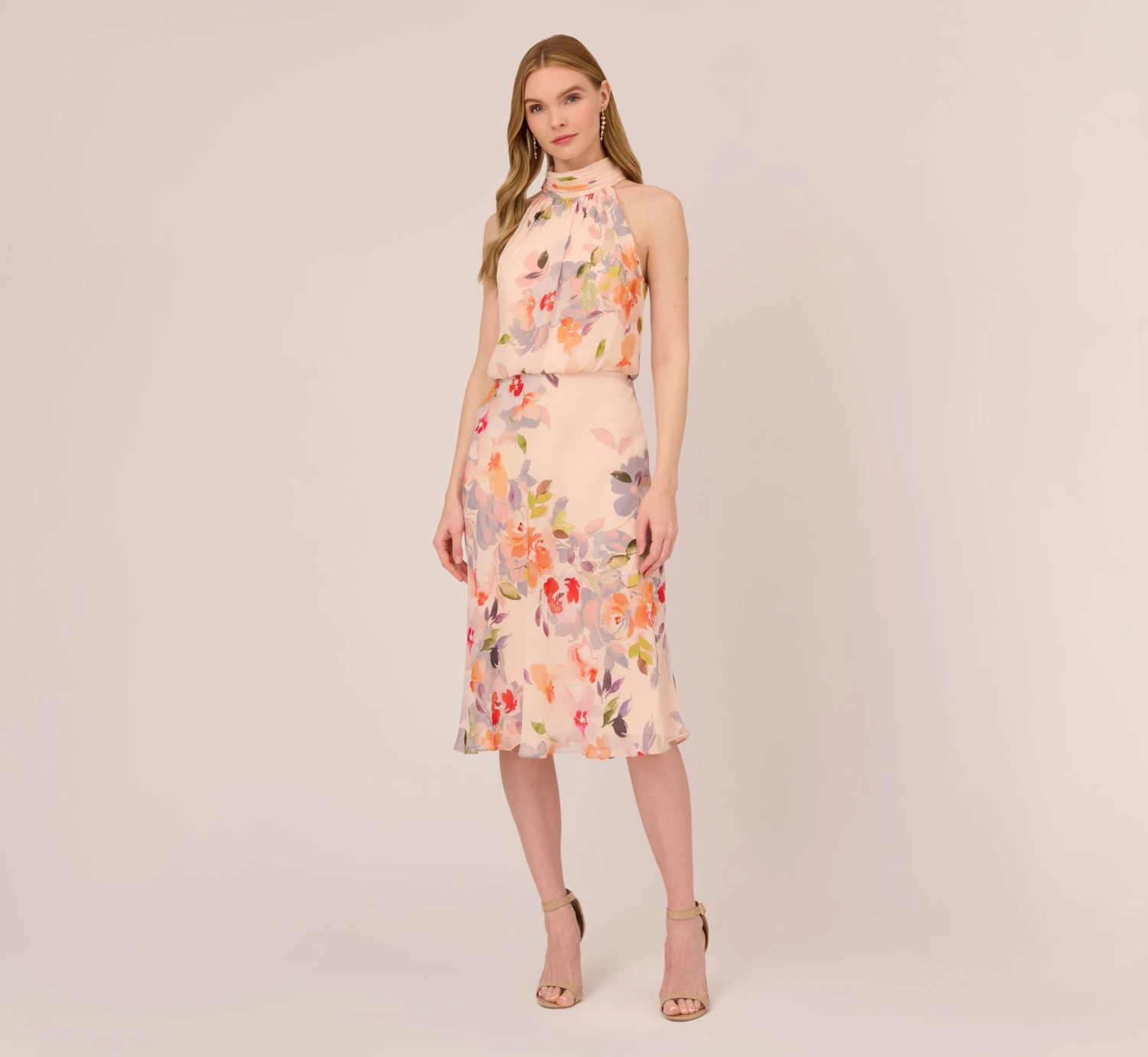 Say hello to your new go-to wardrobe staple. Striking and effortlessly chic, our midi halter dress is crafted of a lightweight woven chiffon and features a romantic floral pattern that blooms allover. A shirred, mock collar tops this versatile style designed with our iconic blouson bodice that hugs your waist and then billows over it and flatters everyone. Halter neckline with back keyhole opening and self-tie closure. The soft skirt is cut on the bias creating an elegant drape.