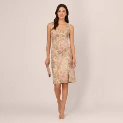 Lightweight and airy, this timeless faux wrap dress is designed in a floral printed woven chiffon with satin stripes and metallic threading for added shine. Features a surplice bodice, three-quarter blouson sleeves with elastic hem. Short wrap skirt with cascading ruffle for added dimension. Finished with a detachable self-tie belt. Back zipper with hook and eye closure.