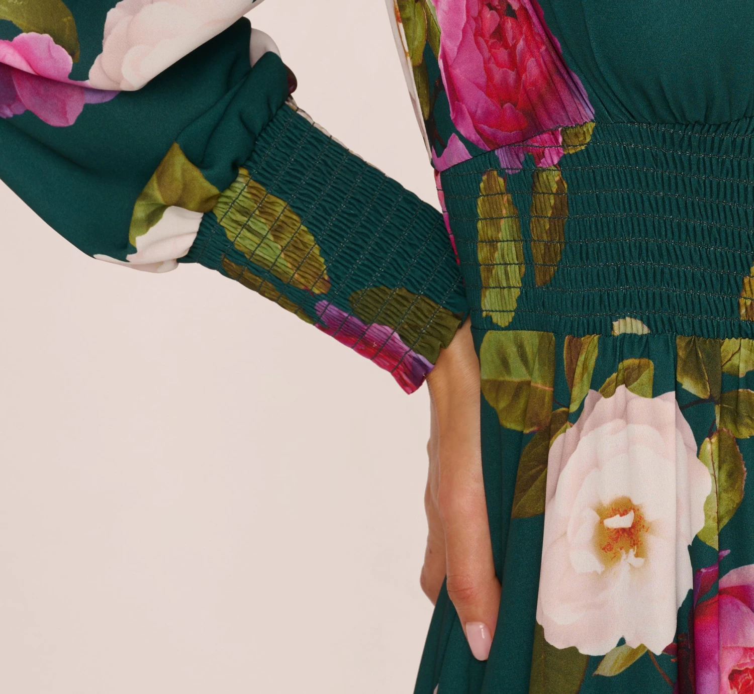 Elegant blooms elevate this versatile long sleeve maxi dress. This maxi dress features a fitted bodice with v-neckline and shirred details, long sleeves, and a soft skirt. Covered in romantic, photorealistic floral print, this maxi dress has smock details at the waist and the cuffs of the sleeves. Style this pretty day-tonight dress with nude heels and a handbag. This floral print dress is perfect for baby showers, bridalbrunches, and so much more.