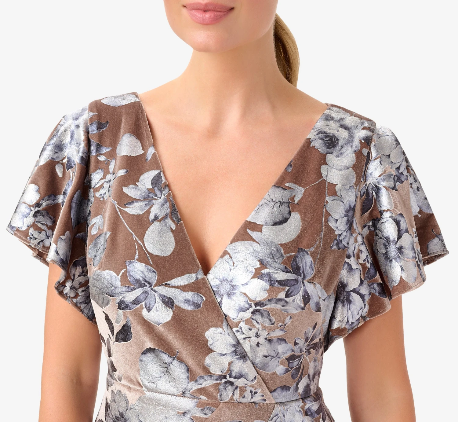 Feminine and fabulous, this floor-sweeping gown is crafted of a luxe stretch velvet and blooms with a shimmering foil floral print. All the chic details: flattering surplice neckline, floaty flutter sleeves. A seamed waist with gentle ruched accents tops the long, soft skirt with modified flared hem. Whether for a wedding or a black-tie event, you can’t go wrong with a dress this polished.