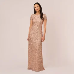 A Grecian style gown is alight with patterns of metallic beads and sequins, finished with wispy godets.This Adrianna Papell design has been made from the finest and most luxurious fabrics. All bead work, embroidery and ornamentation has been done completely by hand. Slight irregularities or variations should not be regarded as defective or damaged, rather a testament to the garment’s unique beauty.