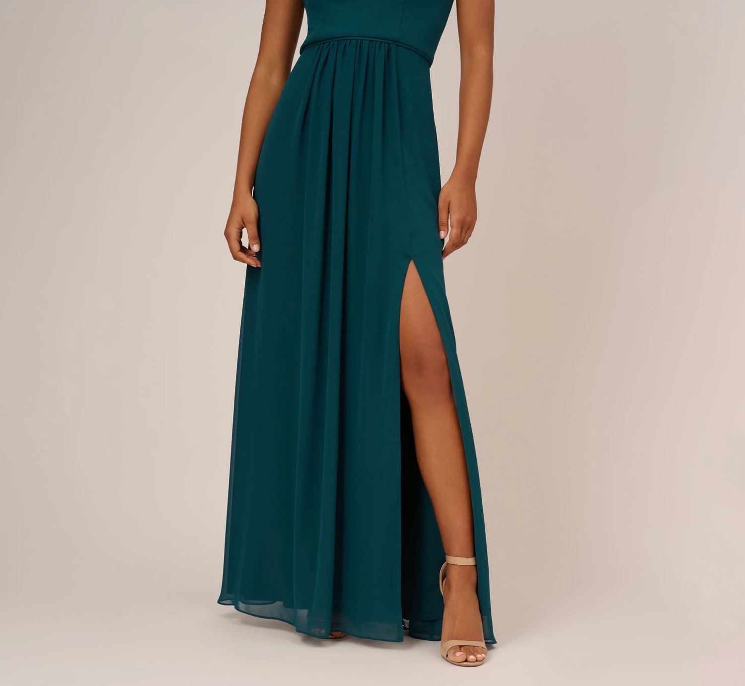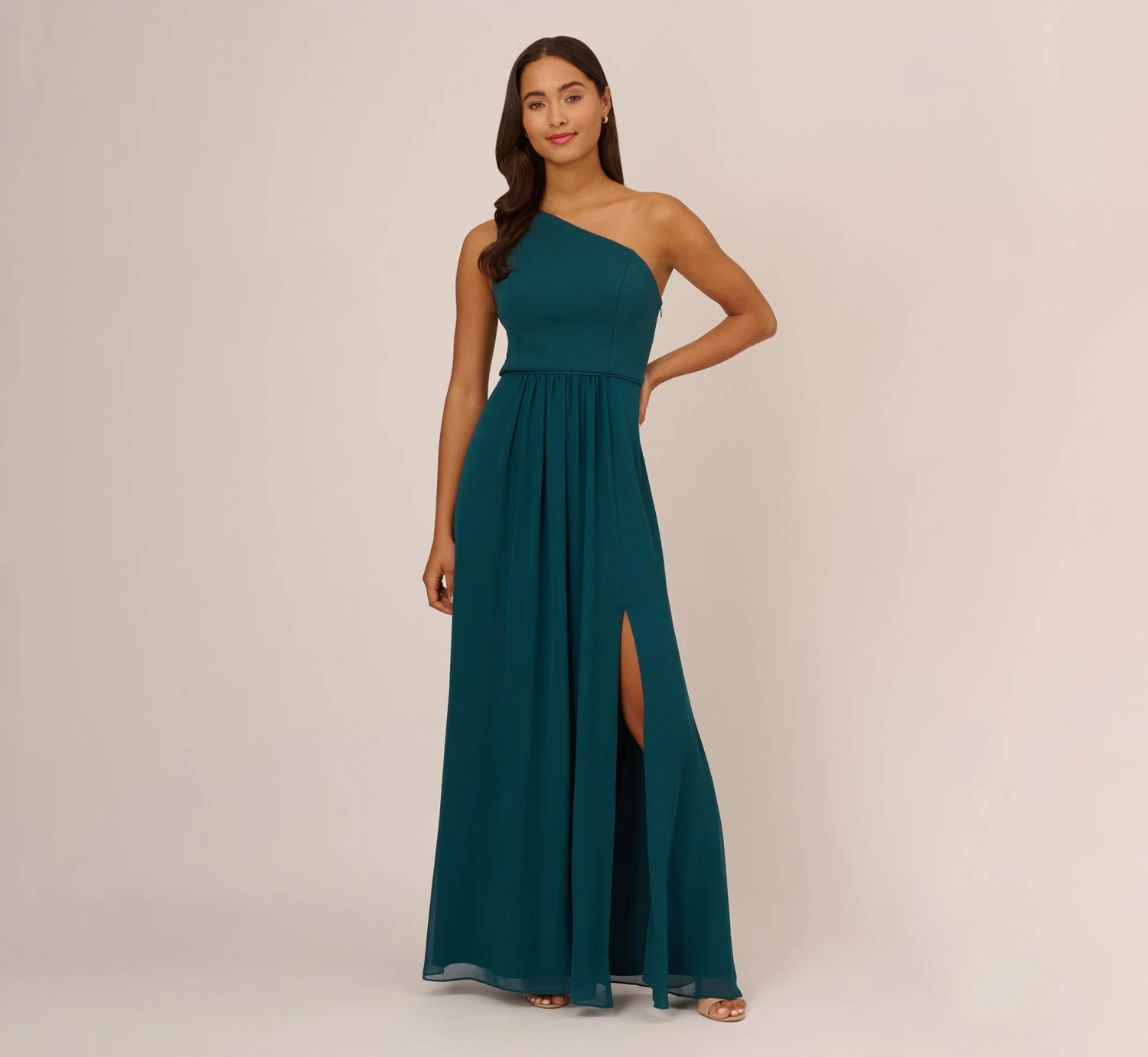 Lightweight, soft and fits like a dream, our woven chiffon floor-sweeping gown features a one-shoulder asymmetric neckline. Details: Pretty pleats at the waist for added dimension and movement. Bridesmaids, party-goers and anytime you have a special occasion, you’re going to look and feel great in this.