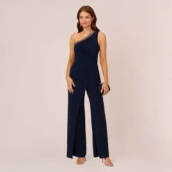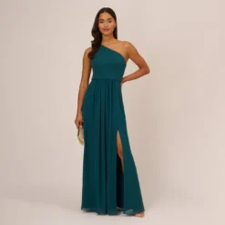 Sleek details elevate this one shoulder gown for your next night out. This formal dress features a fitted bodice with one shoulder neckline, a cutout sleeve, and a column skirt. Designed from jersey fabric, this evening gown has plenty of stretch for a comfortable fit. A thigh-high slit at the skirt and a side zipper closure completes this jersey gown. Styled with metallic high heels and statement earrings, this black-tie dress is ready for anything.
