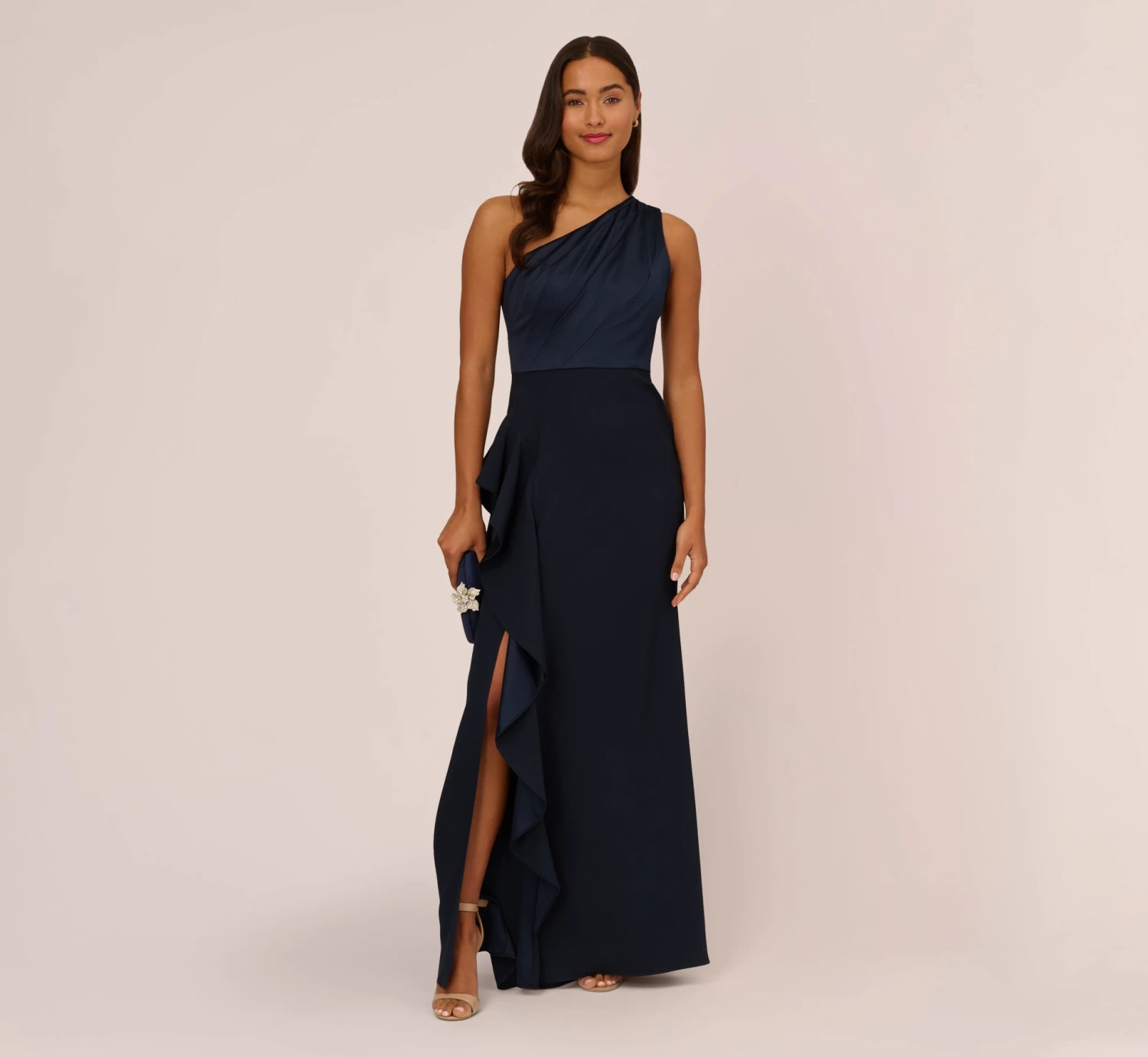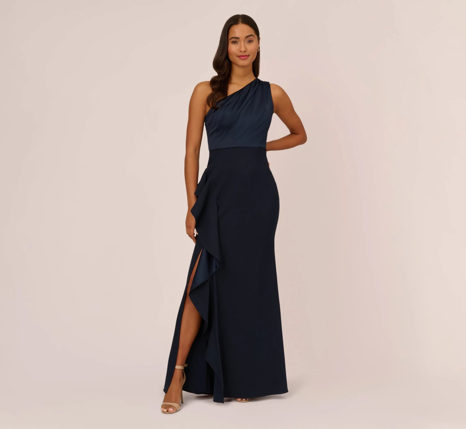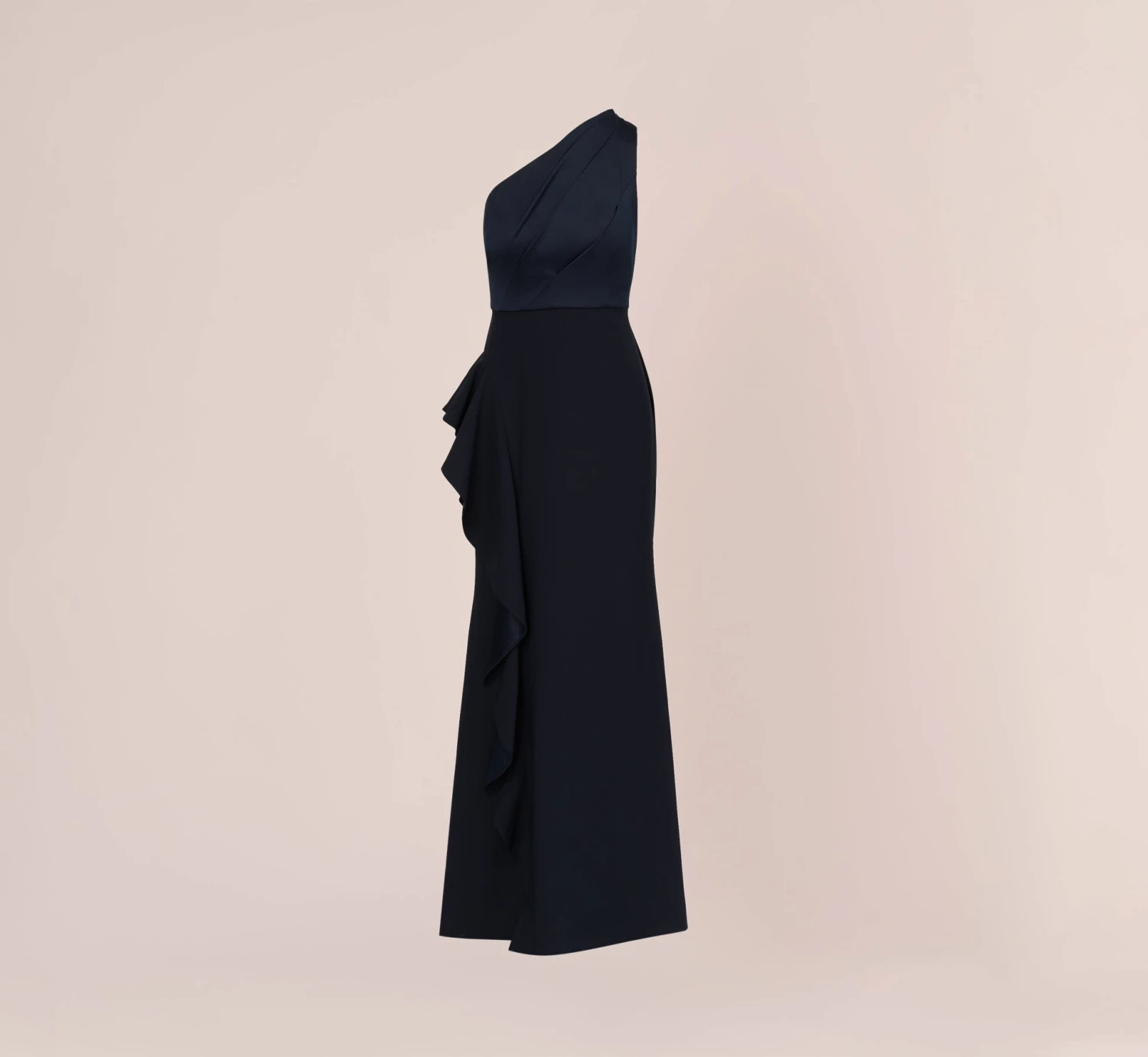 Festive and feminine, a modern gown in silky satin crepe and a chic, one-shoulder strap. Designed in a streamlined silhouette that fits like a dream. Details We Love: the subtle ruffle and exquisite drape of the skirt.
