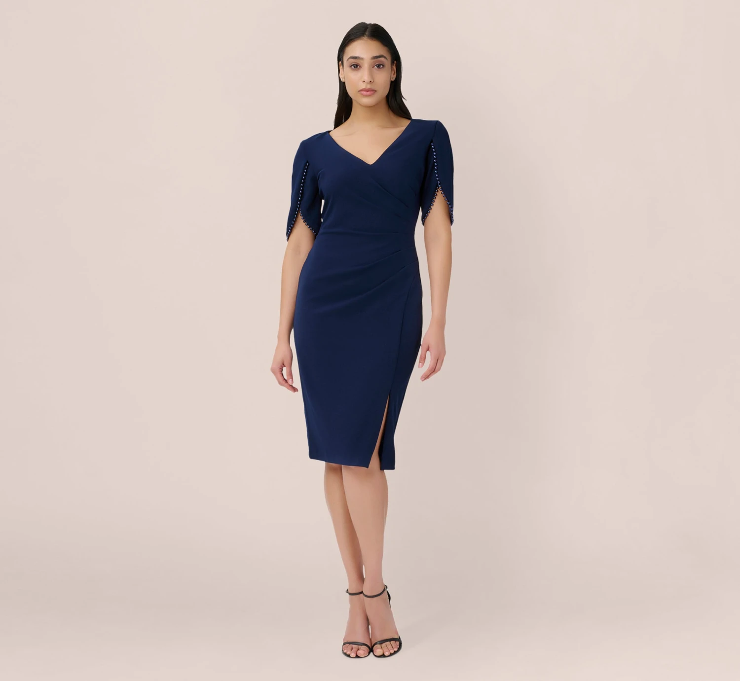 Striking, refined and all-out comfortable, our iconic sheath dress is designed from a soft stretch knit crepe and accented with playful pearl embellishments. Details we love: the ultra-flattering ruching, sleek elbow sleeves and flattering v-neckline. Cocktail parties, black-tie events and wedding receptions, we’re on our way.