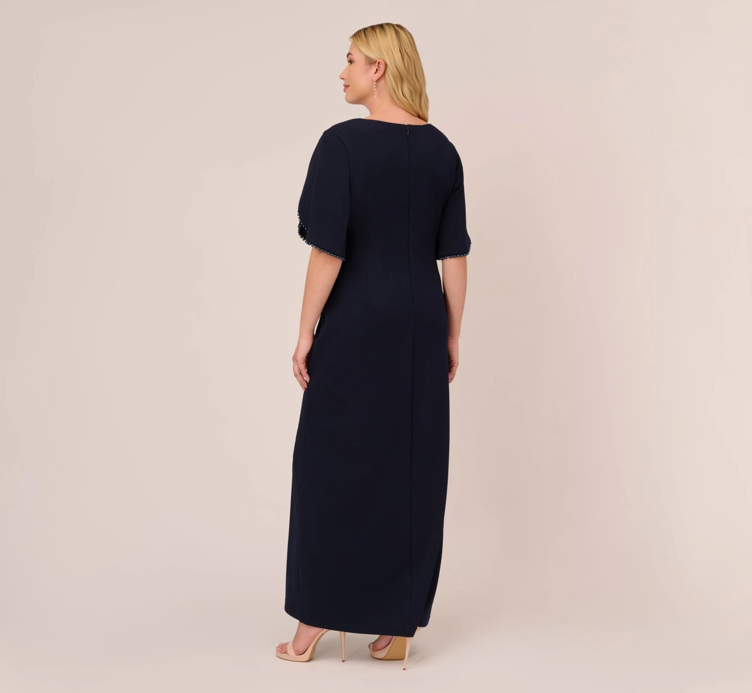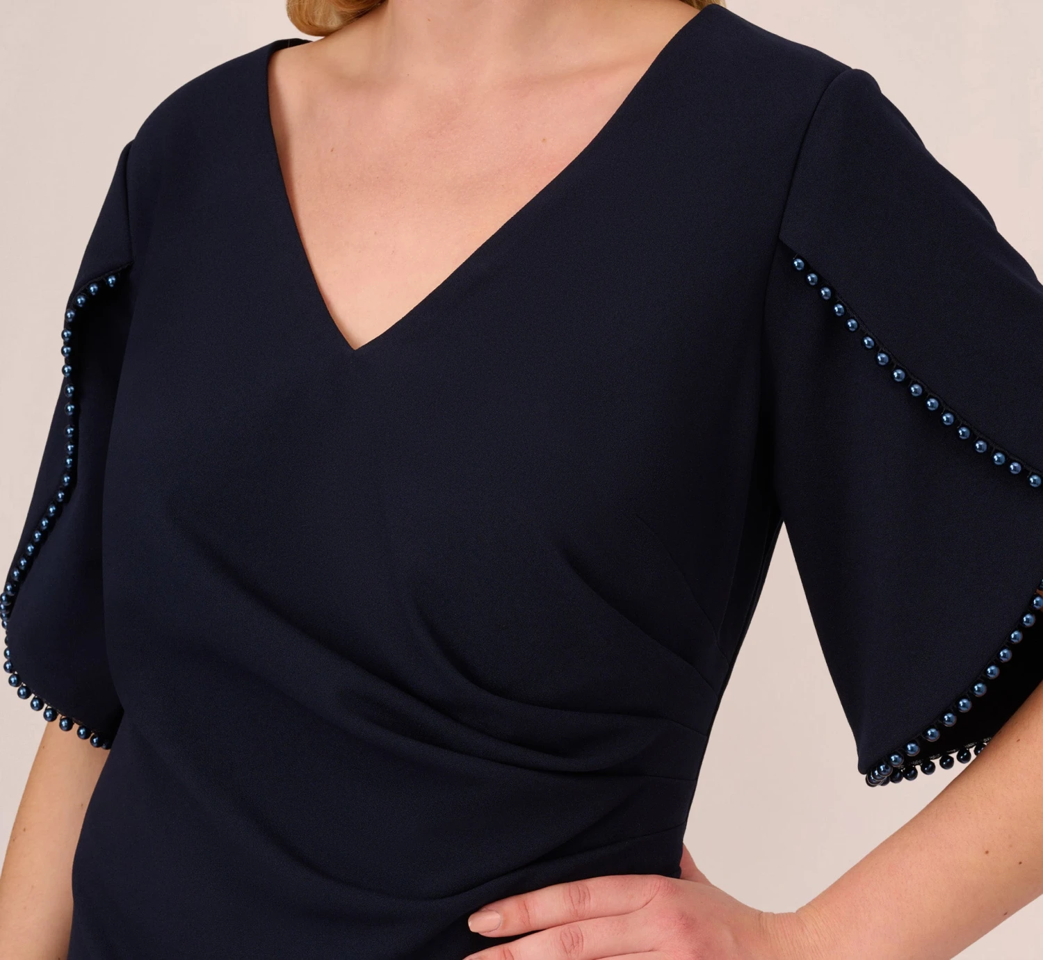 The simplest dresses are often the most timeless, and this short sleeve gown is no exception. This mermaid gown features a fitted bodice with v-neckline, elbow-length sleeves, and a full-length mermaid skirt with slit hem. Adorned in sweet pearl trim, the short sleeves have a petal-like design for added interest. Draped details throughout the crepe fabric make this formal dress a flattering look. A zipper back closes this evening gown. Teamed with a contrasting clutch and heels, this sophisticated dress is perfect for a formal or black-tie wedding or event.