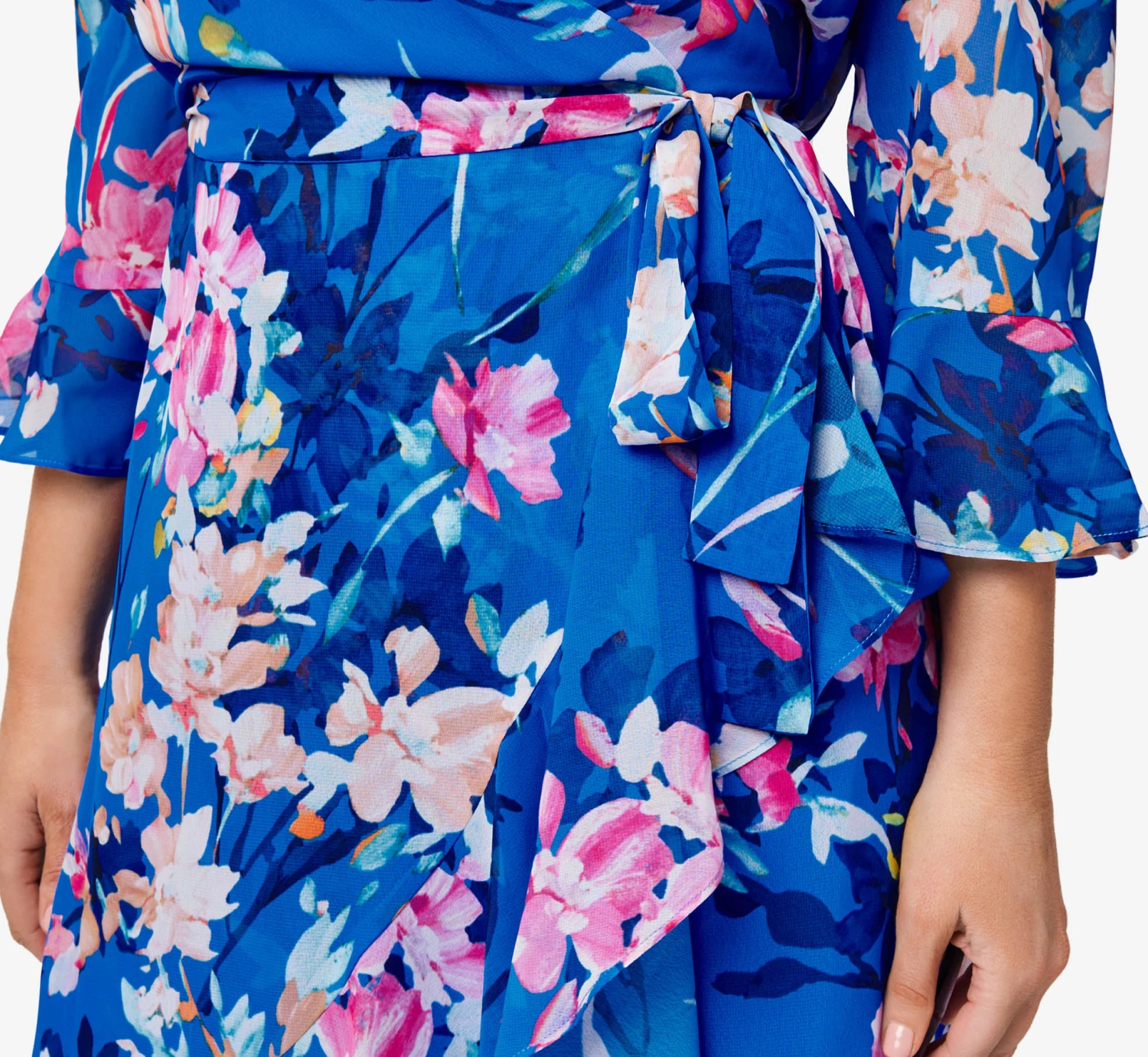 Feminine and flirty, we’re obsessed with this faux wrap dress crafted in a woven chiffon, especially the chic floral print. This versatile style features a surplice top with delicately ruched shoulders and elbow sleeves with bell cuffs. The high/low wrap skirt is finished with a ruffled flounce hem. A self-tie belt finishes this effortlessly chic style. Back hook-and-eye and zip closure. Perfect for brunch, dinner dates, baby/bridal showers and wedding receptions.