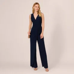 Pretty pintucking makes this jumpsuit a subtly beautiful look no matter the event. This jumpsuit features a sleeveless surplice bodice with pintucked details at the shoulders and waist. Fabric drapes down the wide legs of this jumpsuit, which is crafted from jersey fabric with plenty ofstretch. A zipper at the center back completes this day-to-night jumpsuit. Styled with nude heels and a crossbody clutch, this jumpsuit is a timeless look.