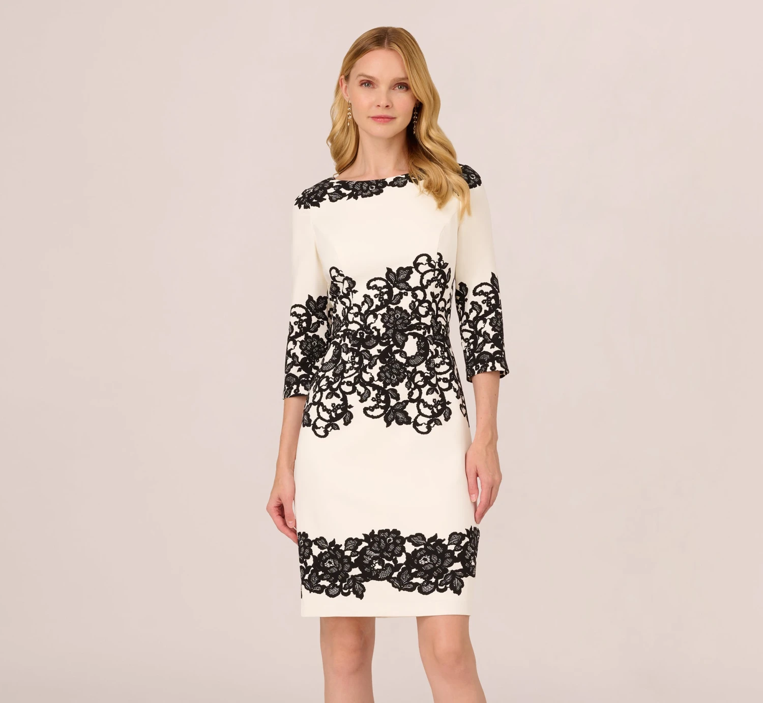 Modern yet timeless, this scroll lace dress is a beautiful look. This sheath dress features a boat neckline, three-quarter sleeves, no waist seam, and a fitted silhouette. Designed with a novelty stretch fabric adorned with scroll lace placed to accentuate the figure, this wear-to-work dress isa classic look. A zipper closure at the center back completes this three-quarter sleeve dress. Paired with neutral heels, this lace-trimmed dress is ideal for baby showers or work conferences.