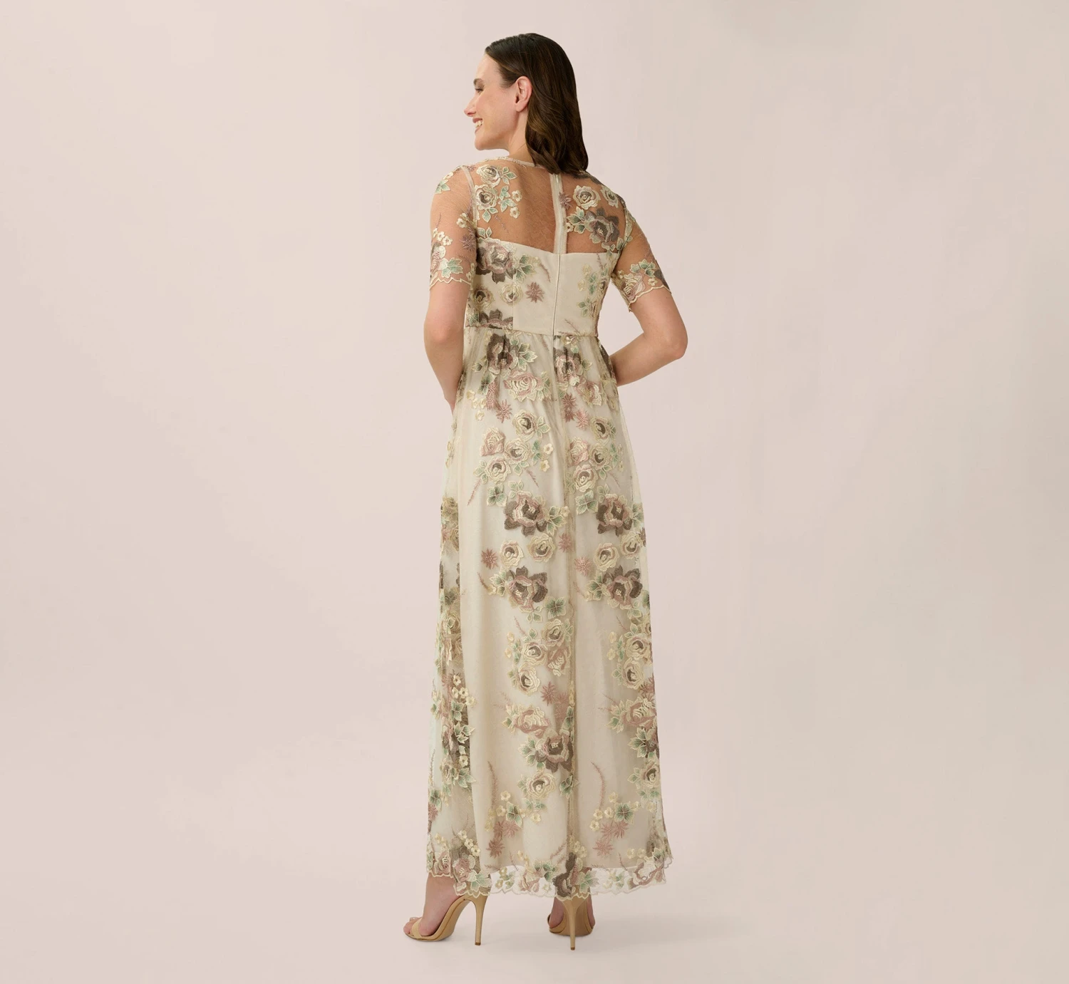 Demure and romantic, this long lace gown is embroidered with vintage inspired rose bouquets. Designed in a stunning curve-skimming silhouette, this A-line dress also features pretty scalloped edging, a sheer boat neckline, back and sleeves. Complement this ultra-feminine look with pretty satin pumps.