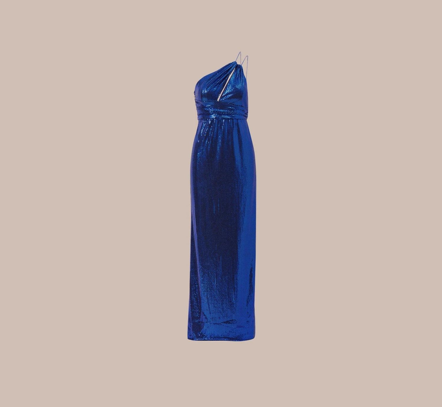 This one shoulder design hugs your curves in all the right places and features an alluring asymmetric bodice with pleated waistband. A striking cutout and thigh-high side slit turn up the volume on its dramatic appeal while the metallic knit fabric adds a glamorous touch. Side zipper with hook and eye closure. Be daring and bold in this showstopping number at prom, wedding celebrations and black-tie galas.