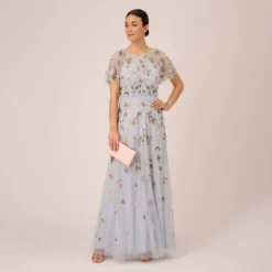 Step into the gala confidently in this incredible beaded ball gown. This formal dress features a circle neckline, fitted bodice, and a full skirt. A dramatic half-cape flows from the shoulders as a dramatic detail. Spectacular sequin beading in gorgeous lattice designs adorns the bodicepunctuated by beaded flower embellishments. Metallic heels are all this gown needs to finish it off.