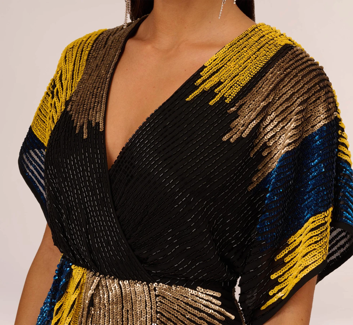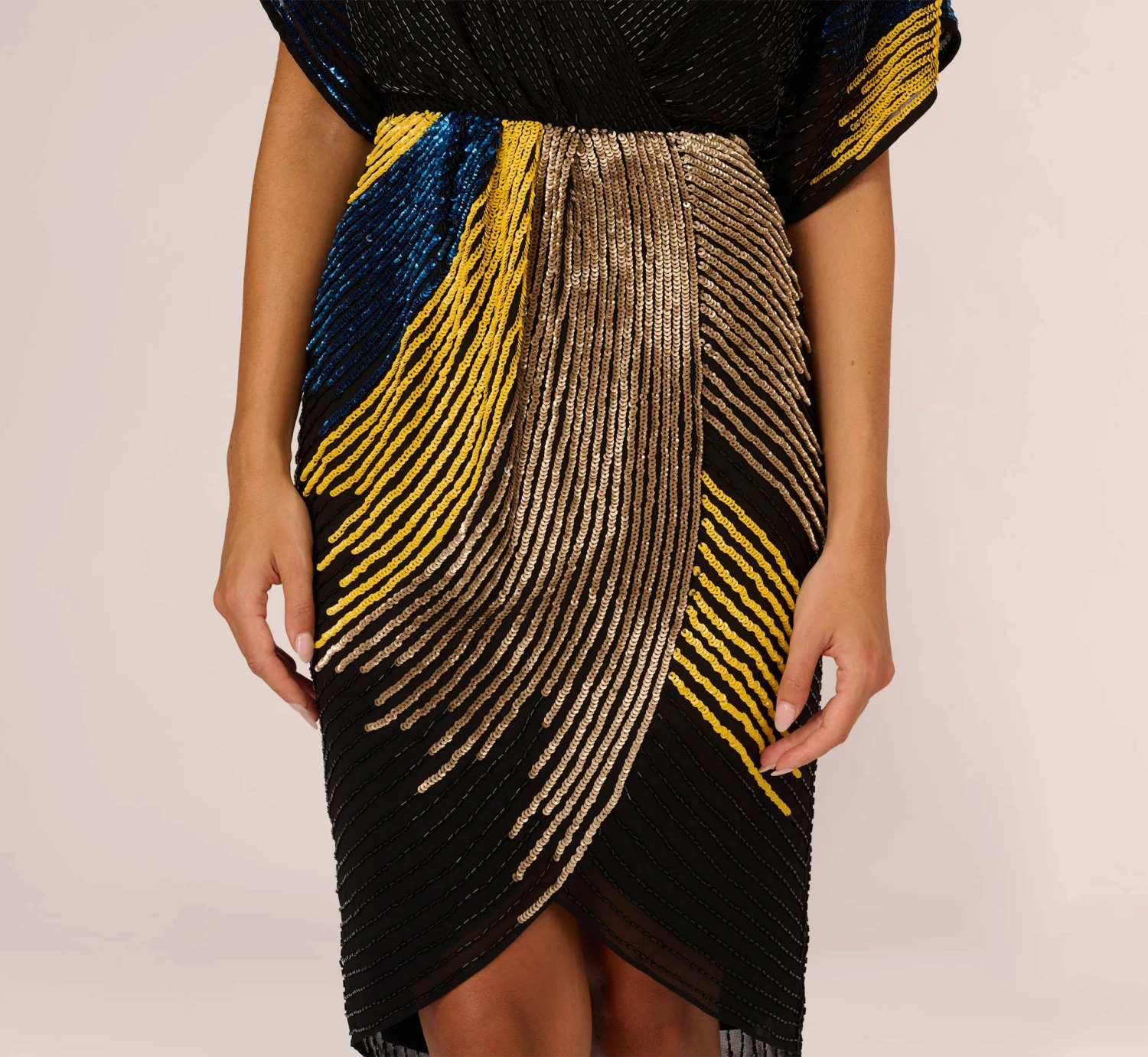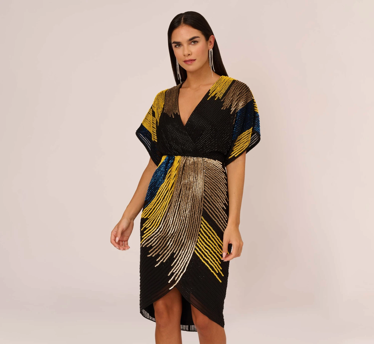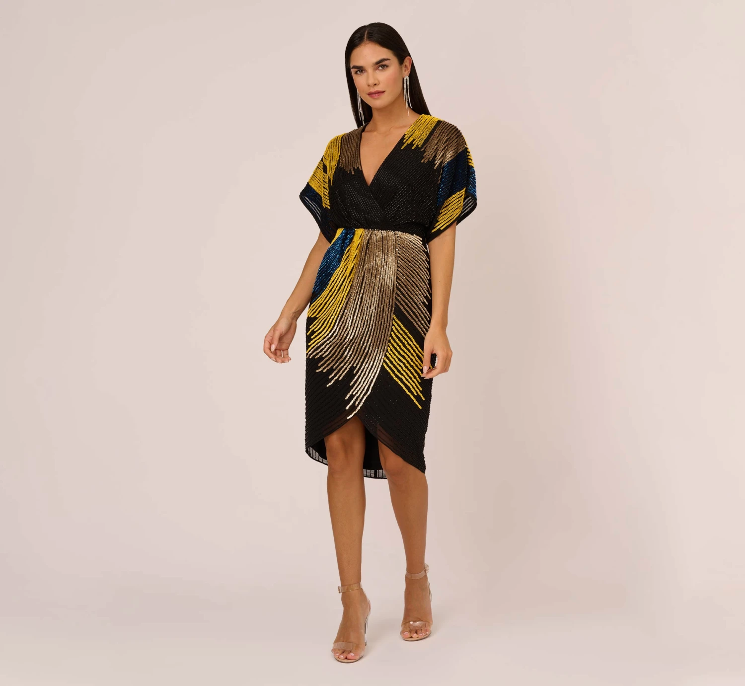 Cheers to a fun night out in this beautifully beaded dress. This cocktail dress features dolman sleeves, a v-neckline, and a faux wrap styling. All over contrasting sequin beading in a figure flattering design shines throughout this dress. Teamed with a simple heel and clutch, this look is award-winning.