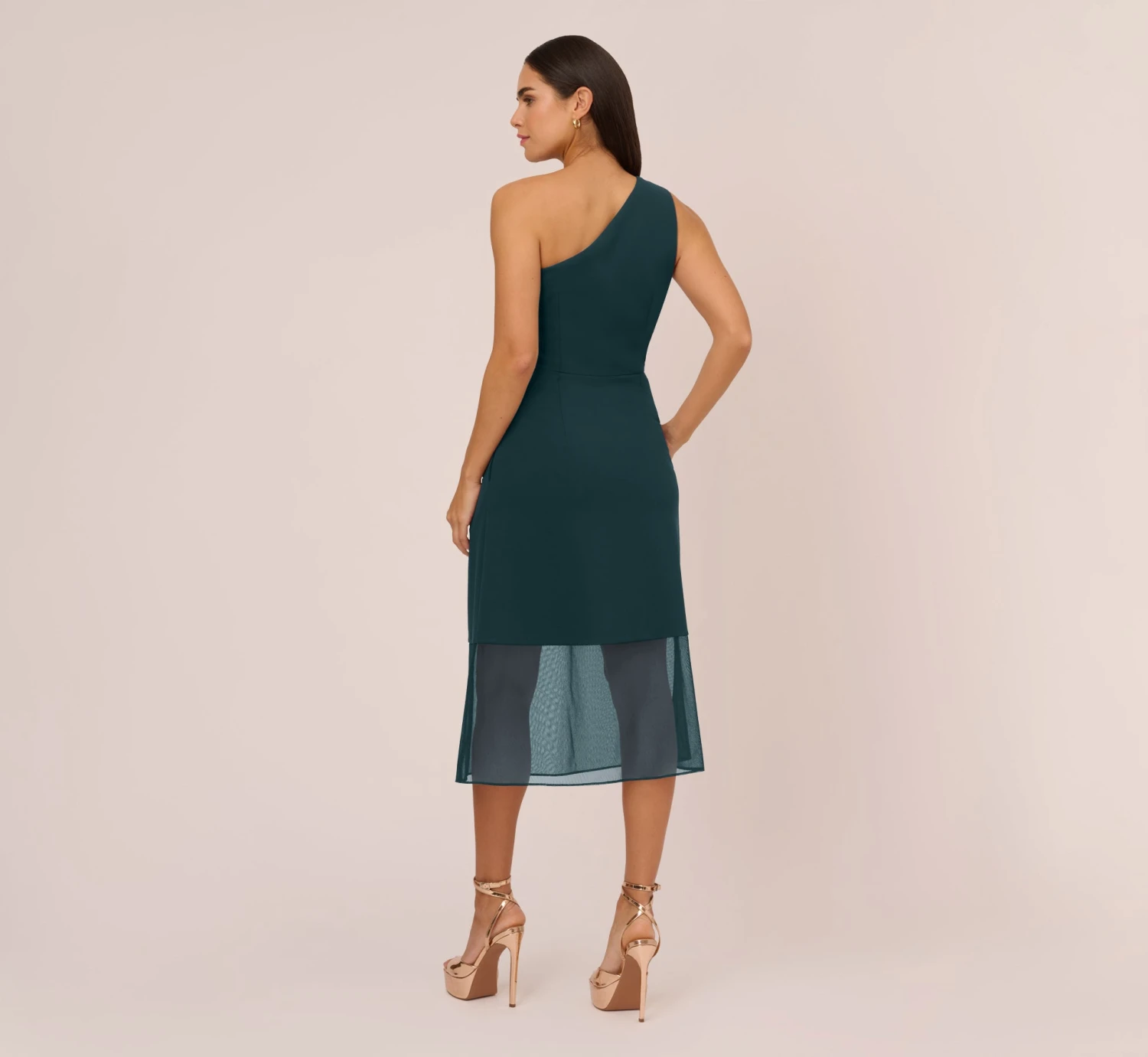Perfect for a spin around the town, this one-shoulder dress will catch the eye. This party dress features a one-shoulder bodice with a sheer cutout at the bust, pockets, and an A-line skirt with a crinoline overlay that extends beyond the lining. Created from knit crepe, this midi dress is a youthful yet elevated look. A side zipper closure completes this cocktail dress. Strappy metallic heels and a beaded clutch that contrasts the hue are the perfect companions for this a-line dress.