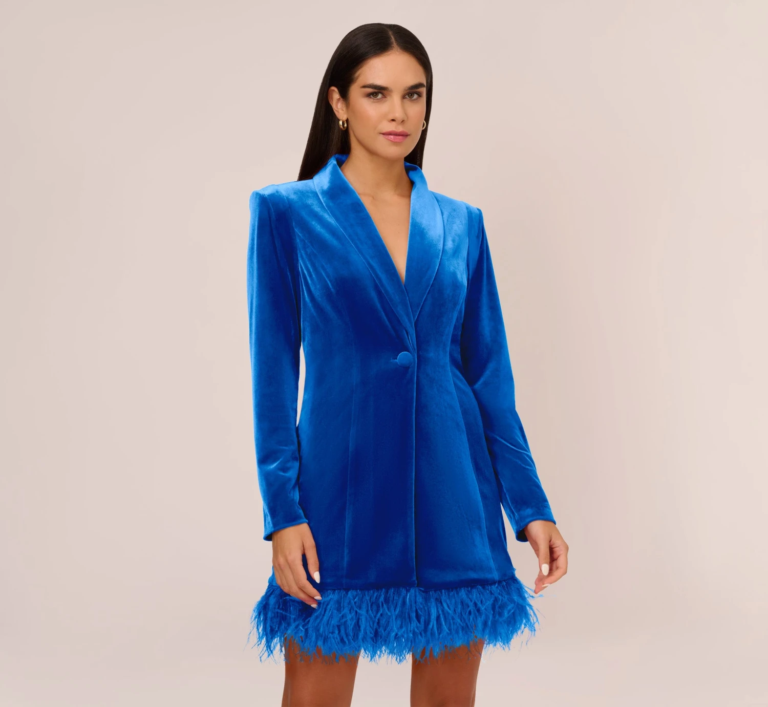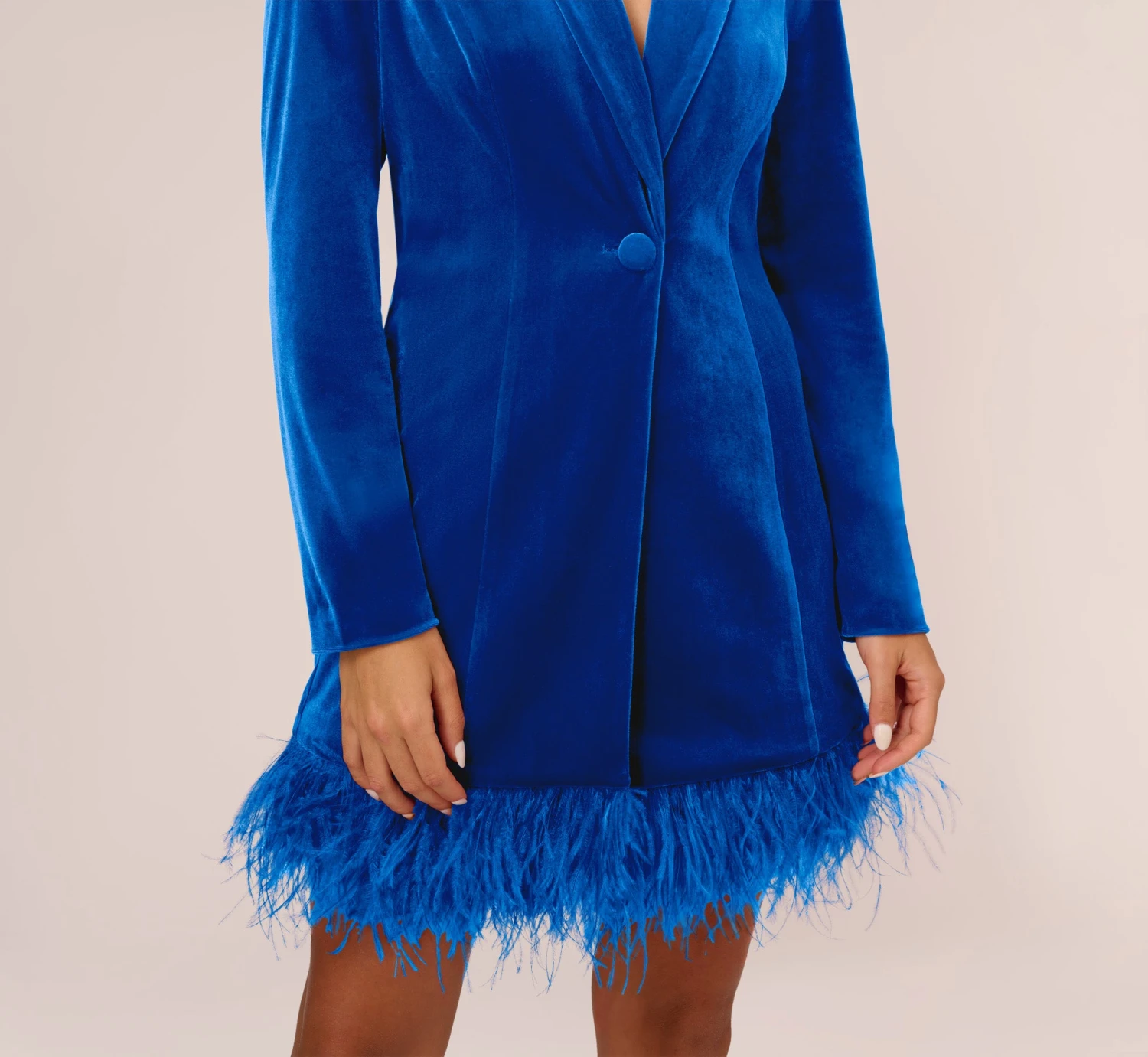 A modern take on the beloved Tuxedo Dress has arrived – and it’s a must-have. This cocktail dress features a tuxedo styling with lapels, a single self-button closure, long sleeves, and shoulder pads. Luxurious details like the velvet fabrication and the thick feather trim at the skirt hem add trend-forward notes to this Tuxedo Dress. Paired with a sparkling handbag and nude heels, this velvet dress scales from semi-formal to formal with ease.