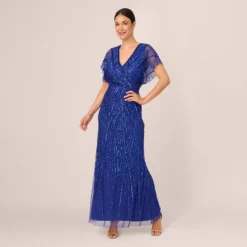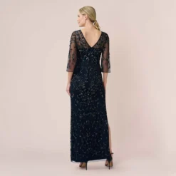 Adrianna Papell Floral Print Off The Shoulder Metallic Crinkled Mesh Long Gown In Aqua Multi