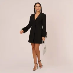 Knit Crepe Long Sleeve Blazer Dress With Feather Trim In Black