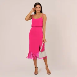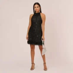 Feather Trimmed Crepe Short Cocktail Trapeze Halter Dress In Forest