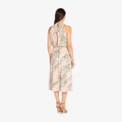 Adrianna Papell Floral-Print Chiffon Tie Neck Halter Long Fit-And-Flare Gown In Aqua Multi