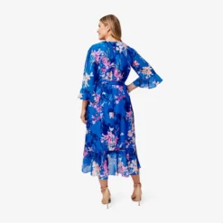 Adrianna Papell Plus Size Flutter Sleeve Floral Print Dress With Tie Front In Peri Multi