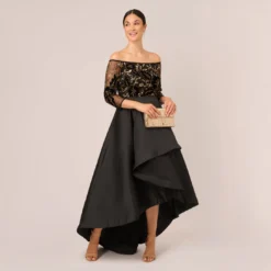 Adrianna Papell Embroidered And Hand-Sequined Illusion A-Line Long Gown In Champagne Gold