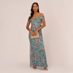 Adrianna Papell Floral Print Off The Shoulder Metallic Crinkled Mesh Long Gown In Aqua Multi