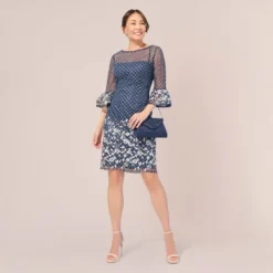 Adrianna Papell Floral Lattice Embroidered Sheath Dress With Sheer Sleeves In Navy Ivory