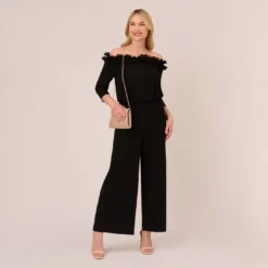 Adrianna Papell Satin Crepe Three Quarter Sleeve Jumpsuit With Buckle Waist In Dark Navy