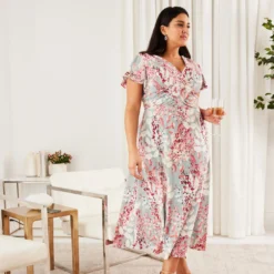 Adrianna Papell Plus Size Flutter Sleeve Floral Print Dress With Tie Front In Peri Multi
