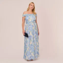 Adrianna Papell Plus Size Watercolor Floral Print Gown With Off The Shoulder Neckline In Blue Multi