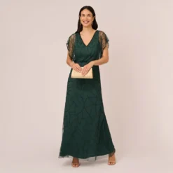 Adrianna Papell Floral Metallic Stencil Midi-Length Mermaid Dress With Capelet In Sea Glass