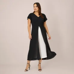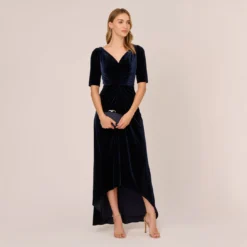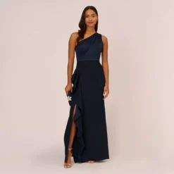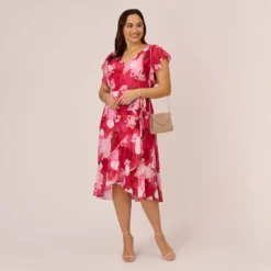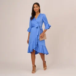 Adrianna Papell Satin Faux Wrap Dress With Ruffled Three-Quarter Sleeves In Precious Peri