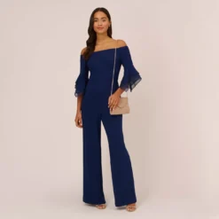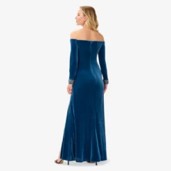Adrianna Papell Velvet Off-The-Shoulder Long Gown With Hand-Beaded Cuff In Ocean Wave