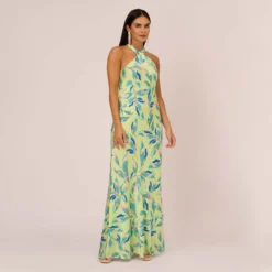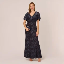 Adrianna Papell Floral Sequin Boho Gown With Lace Up Flutter Short Sleeves In Glacier