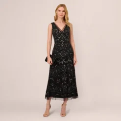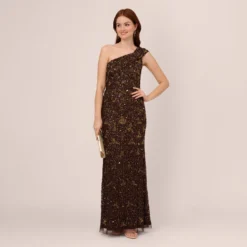 Adrianna Papell Plus Size Hand-Beaded Illusion Long Column Blouson Gown In Jungle Green