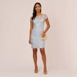 Adrianna Papell Floral Lattice Embroidered Sheath Dress With Sheer Sleeves In Navy Ivory