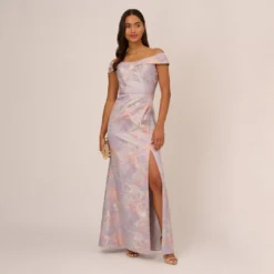 Adrianna Papell Metallic Floral Print Jacquard Gown With Off The Shoulder Neckline In Peri Multi