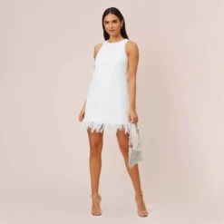 Sequined Trapeze Halter Dress With Feather Trim In Ivory