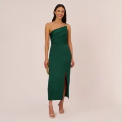 Adrianna Papell Satin Crepe One-Shoulder Long Gown In Willow