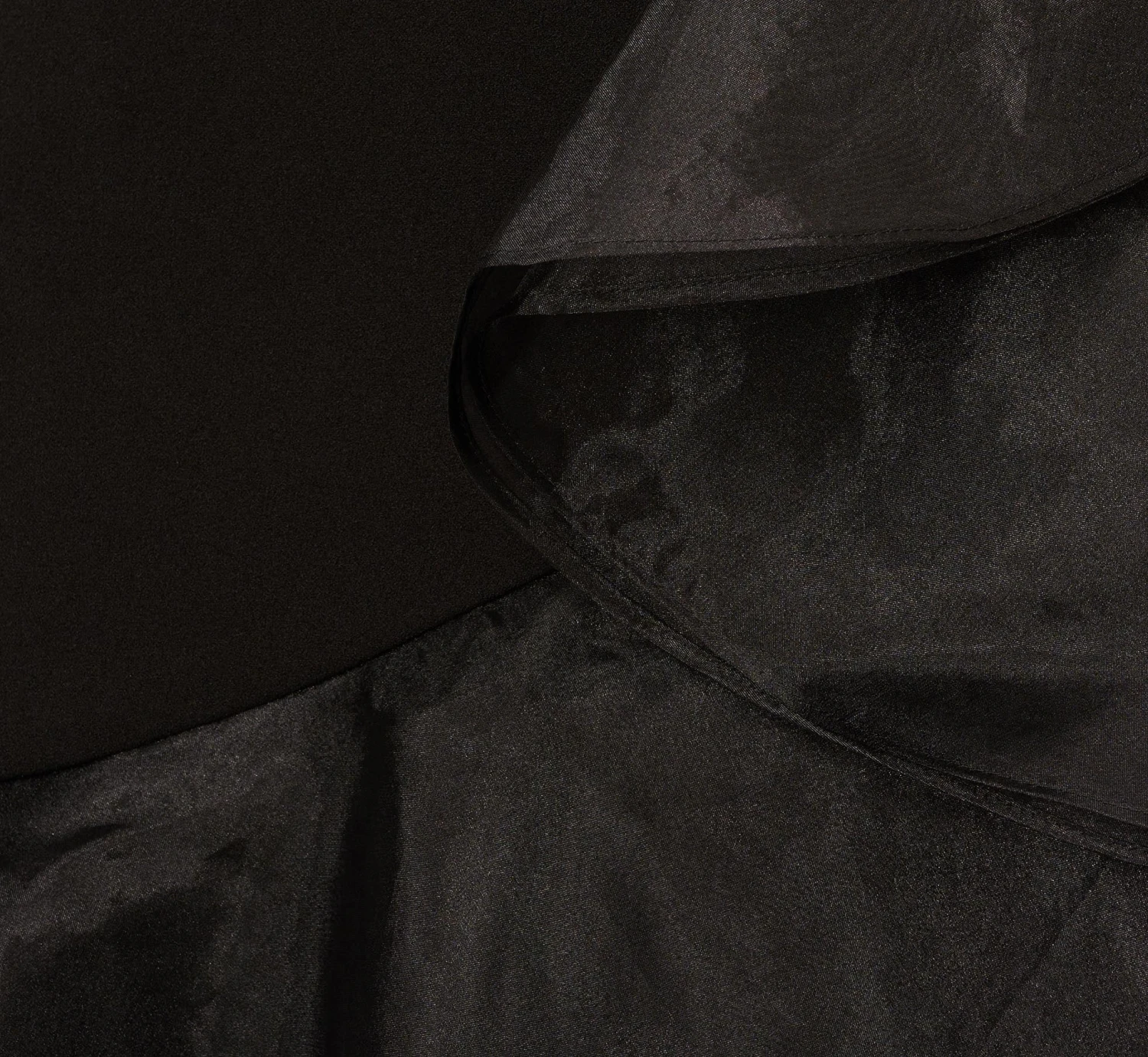 Exude maximum glamour when you opt for this beautiful tiered trumpet dress. This gorgeous formal gown features a plunging neckline with sheer panel, and an eye-catching tiered skirt with cascading ruffles designed to the draw the eye. Other details include cross-back straps and a back zipper closure. All in all, this striking dress brings the drama. Combine this jaw-dropping evening dress with a beaded clutch and strappy heels to steal the show.